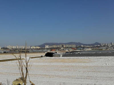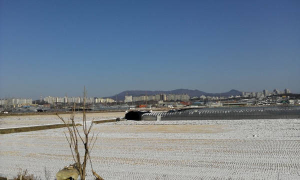 눈덮인 호매실 논밭과 저멀리 광교산 모습